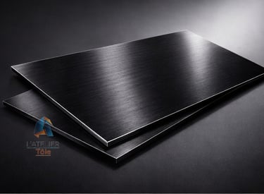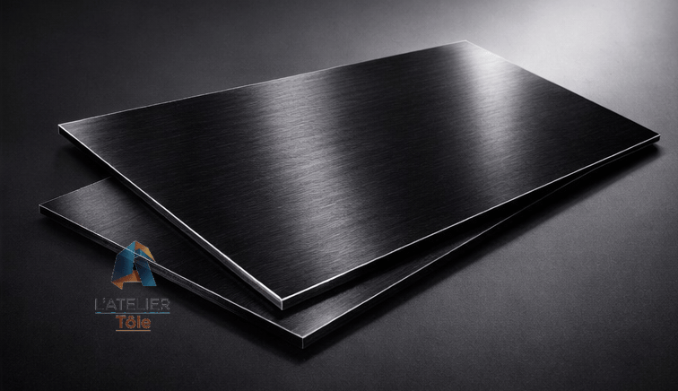Aluminium brossé anodisé noir : fines rayures décoratives, anti-traces, haute résistance à la corrosion. Découpe laser, poids faible, grande rigidité. Formats sur mesure
